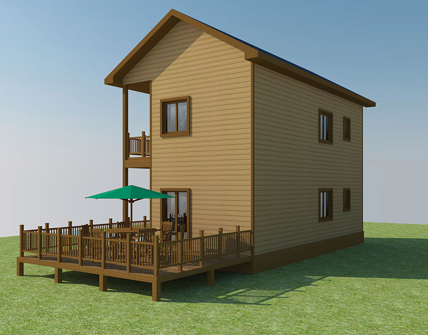 配套建筑部品: 整體為輕鋼結(jié)構(gòu),屋面瀝青瓦+卷材防水(材料可選),外墻用木塑掛板(材料可選),石膏板內(nèi)墻(材料可選),鋁合金門窗(材料可選)。