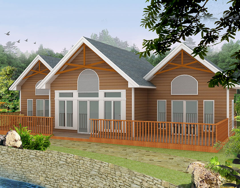 配套建筑部品:整體為輕鋼結構,屋面瀝青瓦+卷材防水(材料可選),木塑掛板復合保溫外墻(材料可選),石膏板內墻(材料可選),鋁合金門窗(材料可選)。