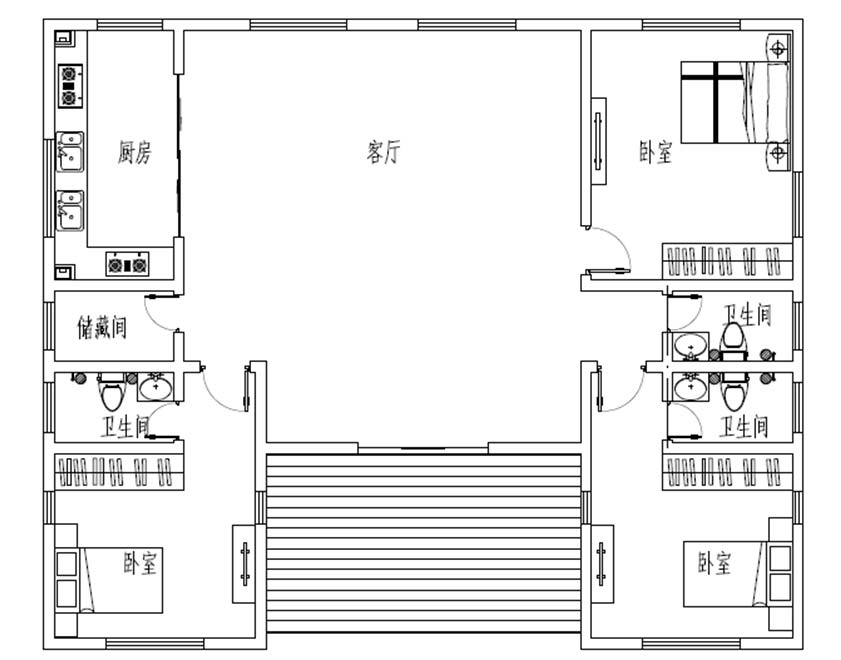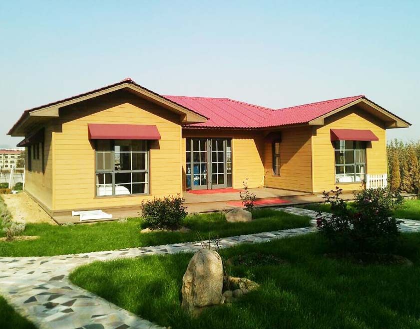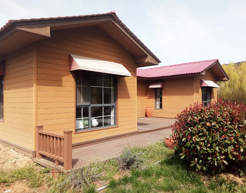 配套建筑部品: 整體為輕鋼結構,屋面樹脂瓦+卷材防水(材料可選),木塑掛板復合保溫外墻(材料可選),石膏板內墻(材料可選),鋁合金門窗(材料可選)。