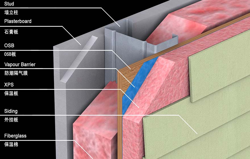 a.墻體填充玻璃纖維棉、保溫砂漿、無機纖維等,外墻覆蓋保溫板,具有良好的保溫、隔熱、隔音性能