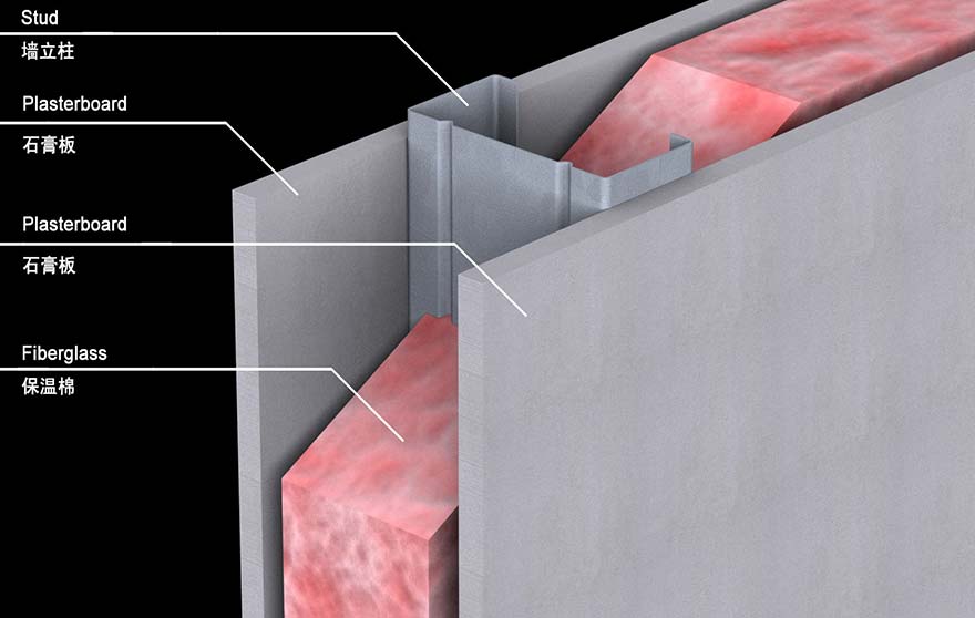 墻體填充玻璃纖維棉、保溫砂漿、無機纖維,墻體兩側可覆蓋防火石膏板、木質桑拿板、竹木纖維板或金屬雕花板等材料。